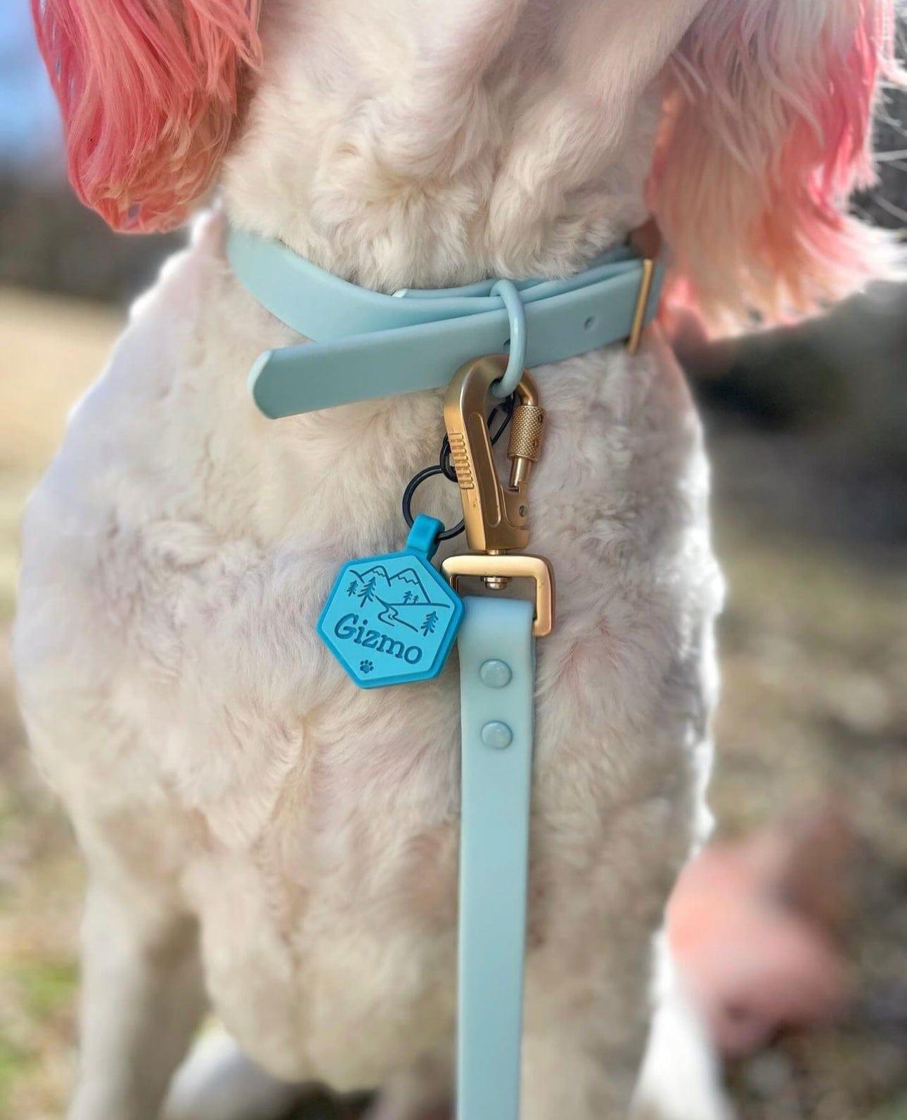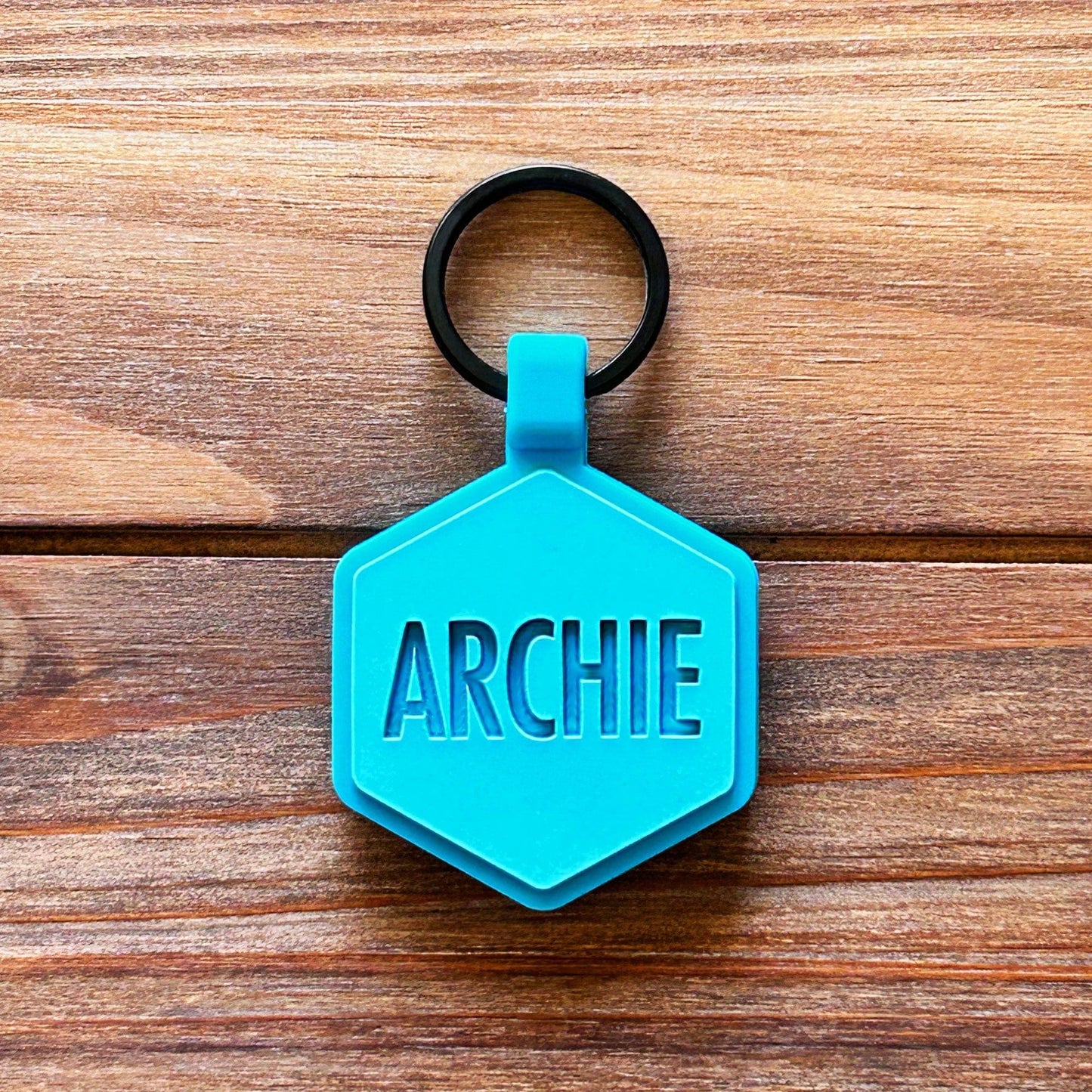 This classic dog tag pairs a modern geometric shape with bright shades of blue.
