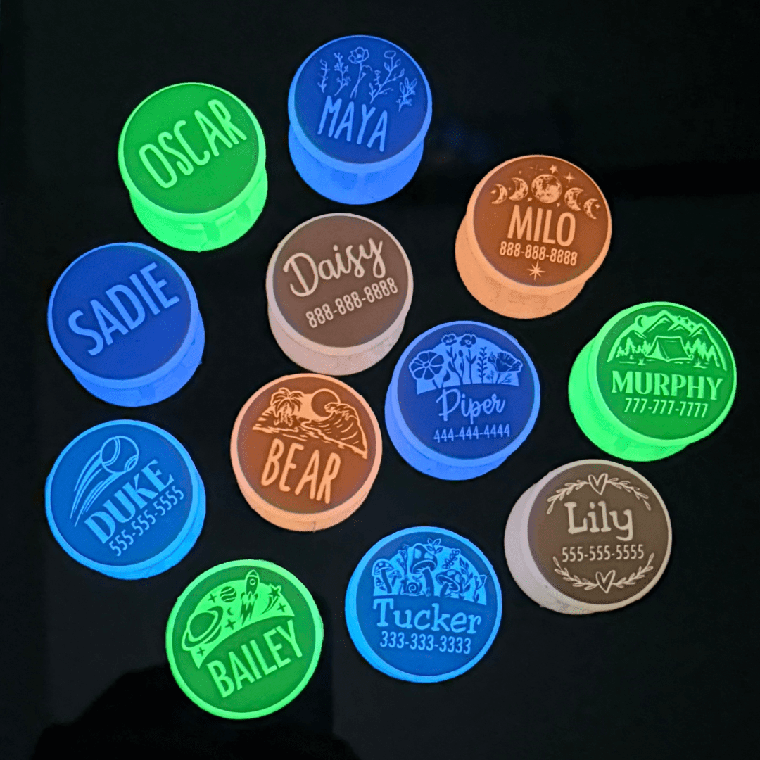 These limited-edition glow-in-the-dark ID tags are designed for pups who don't let sunset stop their style. Each tag features our signature soft, jingle-free silicone with a special twist: a natural glow that lights up their night life.