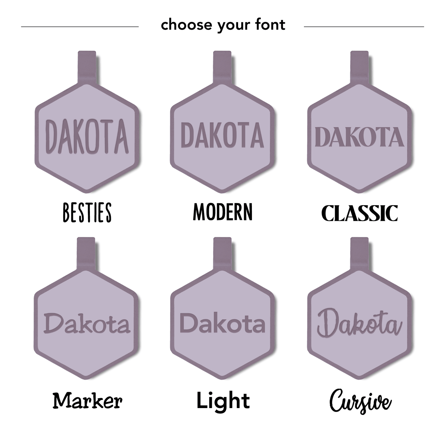 This classic dog tag pairs a modern geometric shape with sophisticated shades of purple.