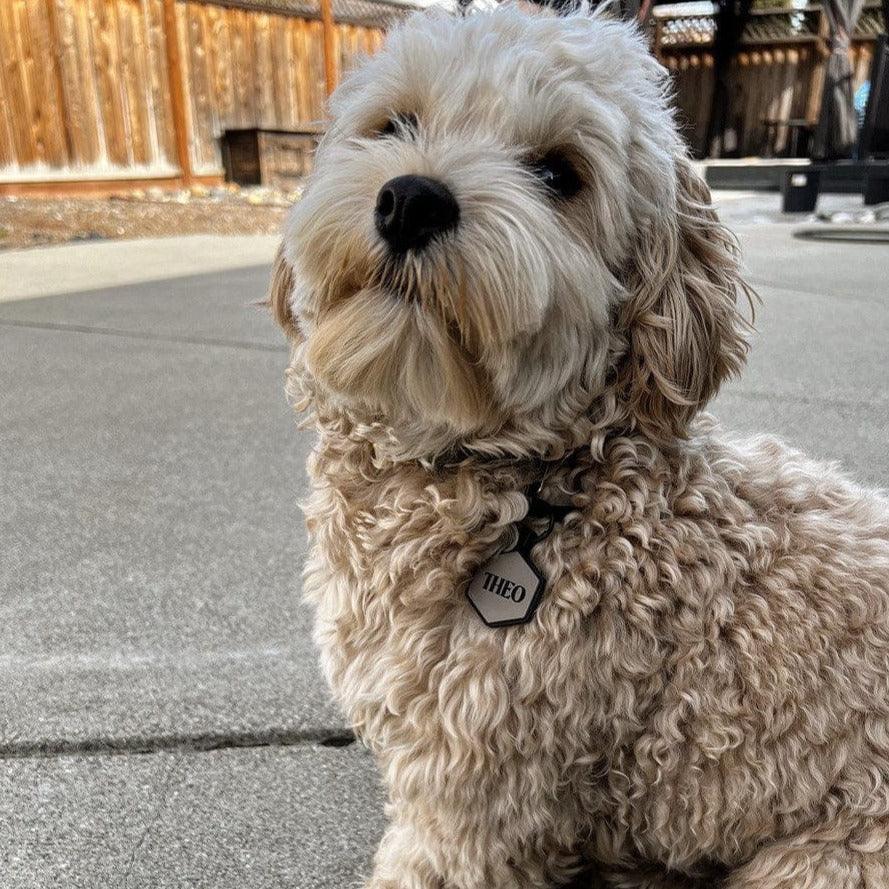 This classic dog tag pairs a modern geometric shape with a classic grey color.