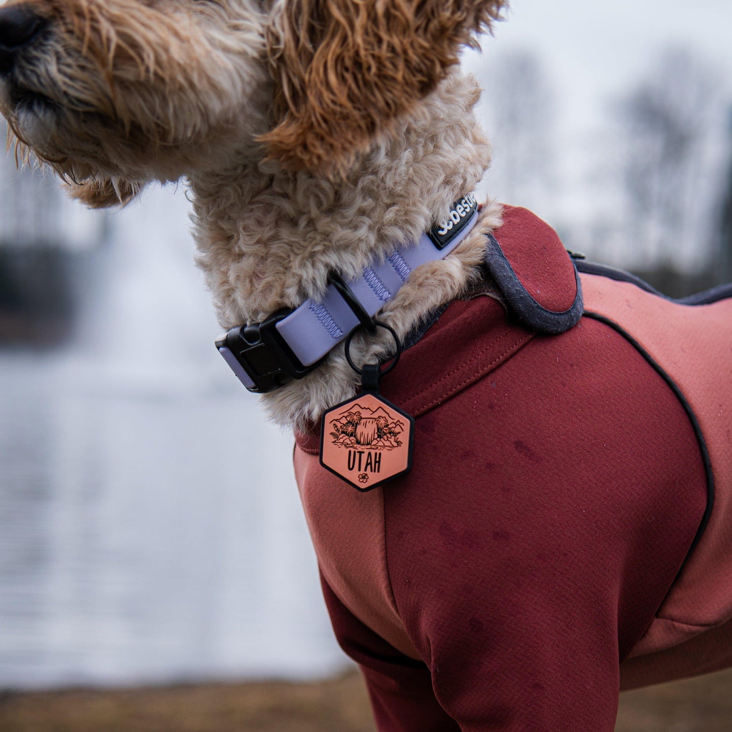 This classic dog tag pairs a modern geometric shape with an earthy terra cotta color.