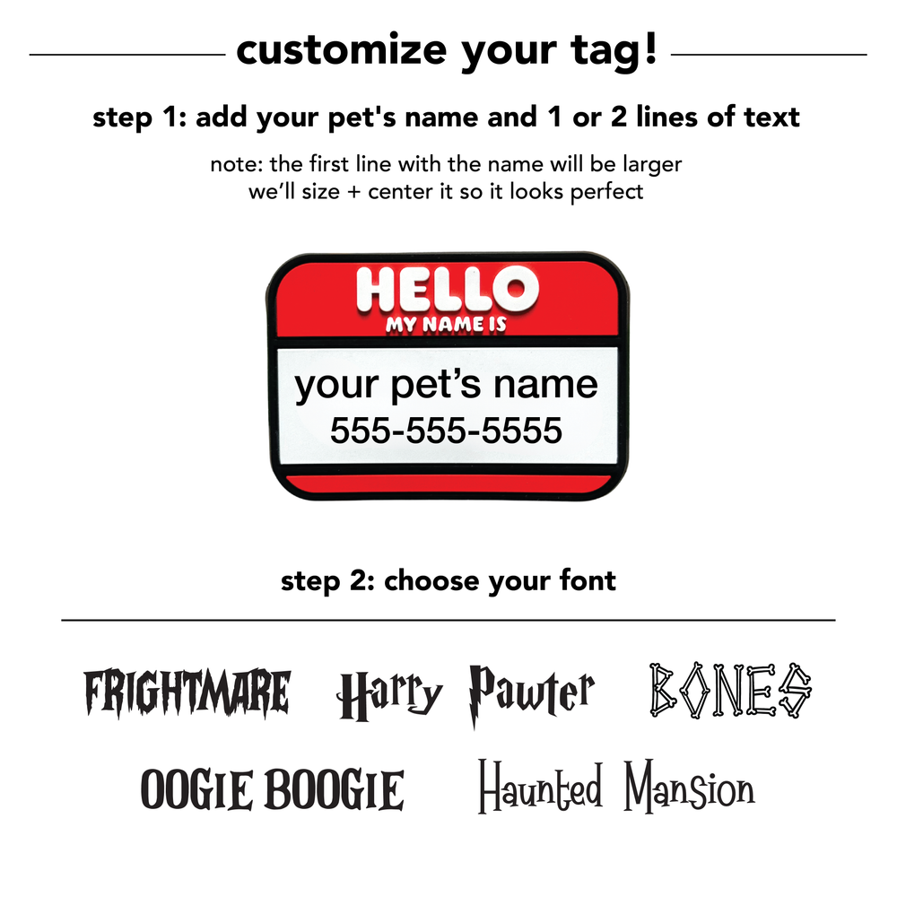 Customize your pup's ID with Halloween-themed doodles (choose up to 4!) and spooky-cute fonts. Pick from jack-o'-lanterns, ghosts, bats, and more to create a tag that's uniquely theirs.